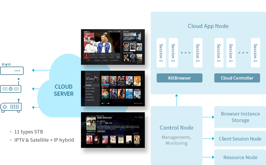 - AltiCloud UI를 적용하면서 서비스 테스트와 배포 기간을 획기적으로 단축하였고, 저사양 legacy STB를 비롯한 다양한 STB에 동일한 서비스가 적용되도록 하였습니다. 이와 함께 서비스를 모니터링할 수 있는 관리 툴도 제공하였습니다. Application 실행 환경이 서버로 이동함에 따라, 고객의 서비스 개선 요구가 다양해져 서비스 품질은 더욱 향상되고 있습니다.