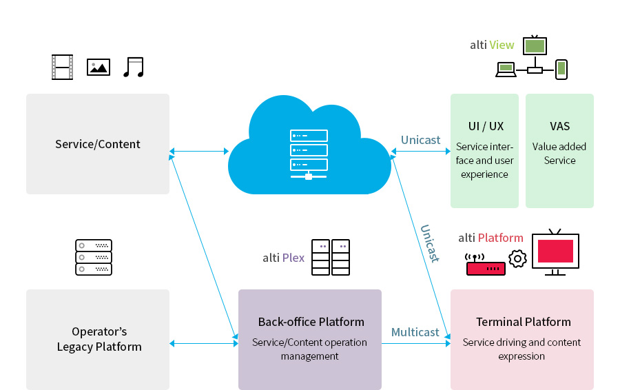 - Alticast Cloud TV 솔루션을 통해 셋톱박스 뿐만 아니라 모바일폰, 테블릿과 같은 다양한 디바이스에 적용할 수 있는 Multi-Screen서비스 플랫폼을 제공했으며, 이는 헤드엔드 시스템, 셋톱박스 미들웨어, UI/UX, CAS/DRM을 포함하는 End-to-End 플랫폼이었습니다. 또한, legacy 백오피스의 Integration을 위한 인터페이스, 호환성과 이식성을 보장하는 추상화 계층, 쉽고 효과적인Management Workflow까지 제공했습니다.